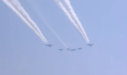 प्रहार फॉर्मेशन में भारतीय सेना का ऑपरेशन सिंदूर का झंडा लिए एक ध्रुव एडवांस लाइट हेलीकॉप्टर, भारतीय वायु सेना का 'रुद्र' ALH-WSI और भारतीय वायु सेना का ALH मार्क IV हेलीकॉप्टर शामिल हैं। ध्वज फॉर्मेशन में 129 हेलीकॉप्टर यूनिट के चार Mi-17 1V हेलीकॉप्टरों द्वारा दिल्ली के कर्तव्य पथ पर फूलों की पंखुड़ियाँ बरसाई जा रही हैं। इस हेलीकॉप्टर फॉर्मेशन का नेतृत्व ग्रुप कैप्टन आलोक अहलावत कर रहे हैं।