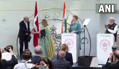 प्रधानमंत्री नरेंद्र मोदी 3 दिनों की यूरोप यात्रा पर हैं। इसी कड़ी में आज वह डेनमार्क पहुंचे थे जहां उन्होंने प्रधानमंत्री मेटे फ्रेडरिक्सन के साथ द्विपक्षीय वार्ता की। इसके बाद प्रधानमंत्री ने मोदी ने अपने शानदार स्वागत के लिए धन्यवाद भी दिया। पीएम मोदी और डेनमार्क के पीएम मेटे फ्रेडरिकसेन के बीच प्रतिनिधिमंडल स्तर की वार्ता हुई। दोनों पक्षों ने हरित सामरिक साझेदारी में प्रगति की समीक्षा की। विदेश मंत्रालय का कहा कि दोनों नेताओं ने कौशल विकास, जलवायु, नवीकरणीय ऊर्जा, आर्कटिक, पी2पी संबंधों आदि के क्षेत्रों में हमारे व्यापक सहयोग पर भी चर्चा की। भारत और डेनमार्क ने कोपेनहेगन में प्रधान मंत्री नरेंद्र मोदी और डेनिश प्रधान मंत्री मेटे फ्रेडरिकसेन की उपस्थिति में आशय पत्र और समझौता ज्ञापनों का आदान-प्रदान भी किया।