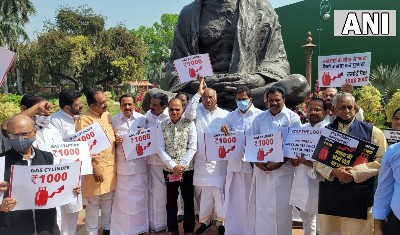 नयी दिल्ली। कांग्रेस के सांसदों ने पेट्रोल, डीजल और रसोई गैस की कीमतों में बढ़ोतरी के खिलाफ बुधवार को संसद भवन परिसर में प्रदर्शन किया। राज्यसभा में नेता प्रतिपक्ष मल्लिकार्जुन खड़गे, लोकसभा में कांग्रेस के नेता अधीर रंजन चौधरी और पार्टी के कई अन्य सांसद राष्ट्रपिता महात्मा गांधी की प्रतिमा के सामने एकत्र हुए और सरकार के खिलाफ नारेबाजी की। कांग्रेस सांसदों ने अपने हाथों में तख्तियां भी ले रखी थीं जिन पर गैस सिलिंडर की तस्वीर थी और उसका मूल्य 1000 रुपये लिखा हुआ था। उन्होंने ‘गरीब, मजदूर, किसान को तंग करना बंद करो’ और ‘जवाब तुमको देना होगा’ के नारे भी लगाए।