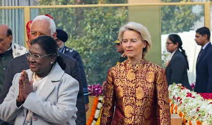 मुख्य अतिथि के रूप में ईयू की नेता सोमवार को 77वें गणतंत्र दिवस समारोह में शामिल हुईं और इस दौरान उन्होंने कत्थई और सुनहरे रंग के रेशमी ब्रोकेड का परिधान पहना था।