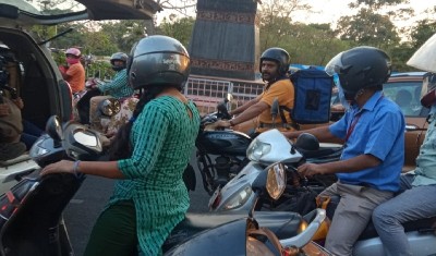 कपिल शर्मा इस तस्वीर में बाइक पर ऑरेंज टीशर्ट पहने हुए नजर आ रहे हैं साथ ही डिलीवरी बैग भी अपनी पीठ पर टांगा हुआ है। साथ ही सिर पर ब्लू कलर का हेलमेट है। कपिल सिग्नल पर गाड़ियों के बीच अपनी बाइक लेकर खड़े हुए हैं।