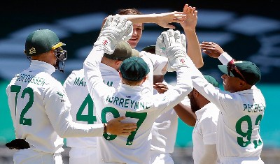 जेनसन ने 31 रन देकर चार विकेट चटकाए जबकि तेज गेंदबाजों कागिसो रबाडा (64 रन पर तीन विकेट) और डुआने ओलीवियर (64 रन पर तीन विकेट) ने उनका अच्छा साथ निभाया। दक्षिण अफ्रीका ने एक विकेट पर 35 रन बनाकर अपना पलड़ा कुछ भारी रखा। दिन का खेल खत्म होने से पहले दक्षिण अफ्रीका ने ऐडन मार्कराम (07) का विकेट गंवाया जिन्हें मोहम्मद शमी (15 रन पर एक विकेट) ने पगबाधा आउट किया। स्टंप के समय कीगन पीटरसन और कप्तान डीन एल्गर दोनों जीवनदान का फायदा उठाकर क्रमश: 14 और 11 रन बनाकर खेल रहे थे। दक्षिण अफ्रीका की टीम अब भी भारत से 167 रन से पीछे है। दक्षिण अफ्रीका की शुरुआत भी अच्छी नहीं रही और शमी ने चौथे ओवर में ही मार्कराम को पगबाधा कर दिया।