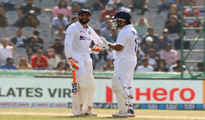 मोहाली। भारत और श्रीलंका के बीच पंजाब क्रिकेट एसोसिएशन, मोहाली में पहला टेस्ट मैच खेला जा रहा है। पहले टेस्ट के पहले दिन का खेल समाप्त होने तक भारत ने 6 विकेट के नुकसान पर 357 रन बना लिए थे। दिन का खेल खत्म होने के समय रविंद्र जडेजा 45 रन बनाकर नाबाद रहे जबकि उनके साथ रविचंद्रन अश्विन 10 रन बनाकर नाबाद हैं। अपना 100वां टेस्ट मैच खेल रहे पूर्व कप्तान विराट कोहली ने शानदार तरीके से शुरुआत की और 45 रन बनाए अच्छी शुरुआत मिलने के बावजूद विराट कोहली बड़ी पारी खेलने में नाकाम रहे। विकेटकीपर बल्लेबाज ऋषभ पंत ने आक्रमक तरीके से धुआंधार पारी खेली और 97 गेंदों में 9 चौके और 4 छक्कों की मदद से 96 रन बनाए। भारत ने आखिरी सत्र में 158 रन जोड़कर इस मैच में अपनी स्थिति को मजबूत कर ली। पंत ने बाएं हाथ के स्पिनर लसिथ एंबुलदेनिया (107 रन पर दो विकेट) के एक ओवर में 22 रन बटोरे। पंत ने इस तरह स्टेडियम में पसरे उस सन्नाटे को दूर किया जो कोहली के आउट होने के बाद कुछ देर के लिए हावी हो गया था। कोहली के लिए एतिहासिक दिन के मौके पर हालांकि पंत छाए रहे।