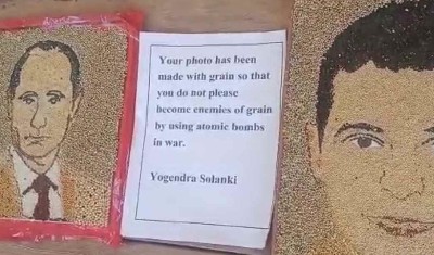 भोपाल। मध्य प्रदेश के नर्मदापुरम में एक किसान ने अनाज से कई नेताओं और भगवान की पेंटिंग बनाई है। ऐसे में किसान ने यूक्रेन और रूस के बीच चल रहे युद्ध को लेकर दोनों ही देशों के राष्ट्रपतियों की तस्वीरें बनाकर एक अनोखी सीख दी है। किसान ने दोनों देशों के राष्ट्रपतियों से अपील कि है कि वो युद्ध में परमाणु बमों का इस्तेमाल करके अनाज के दुश्मन न बनें।
