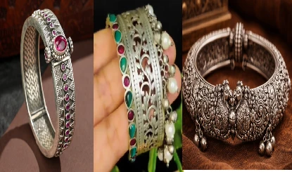 आजकल सिल्वर ऑक्सीडाइज्ड में कुंदन कड़े के चलन काफी चल रहा है। इन कड़े में खूबसूरत फूलों का डिजाइन बनाया जाता है। रेड सूट के साथ आप चांदी का ये कड़ा पहन सकते हैं। ये एकदम स्टाइलिश और मॉर्डन कंट्रास्ट लुक देगा। इसको आप पूजा में भी पहन सकती हैं।