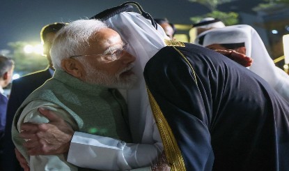 कतर से आए अमीर शेख तमीम बिन हमद अल थानी भारत दौरे पर आए हुए हैं। पीएम मोदी खुद जिस गर्म जोशी से सारे प्रोटोकॉल तोड़कर उनका स्वागत करने के लिए इंदिरा गांधी इंटरनेशनल एयरपोर्ट पर पहुंचे। जैसे ही कतर के अमीर ने उन्हें देखा वो मुस्कुराते हुए उनके गले लग गए। 17 और 18 फरवरी को भारत के राजकीय यात्रा पर पहुंचे कतर के अमीर पीएम मोदी के साथ द्विपक्षीय संबंधों के पहलुओं पर बातचीत होगी। पीएम मोदी ने अपने कतर वाले 'भाई' को गले लगाया। साथ ही पीएम ने कहा कि अपने भाई, कतर के अमीर महामहिम शेख तमीम बिन हमद अल थानी का स्वागत करने के लिए हवाई अड्डे पर गया।