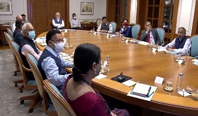 नयी दिल्ली। प्रधानमंत्री नरेंद्र मोदी ने कोरोना वायरस संक्रमण की मौजूदा स्थिति को लेकर बुधवार को वरिष्ठ अधिकारियों के साथ एक हाई लेवल बैठक की। इस बैठक की अध्यक्षता प्रधानमंत्री मोदी ने की। जिसका एक वीडियो सामने आया है। इस वीडियो में प्रधानमंत्री मोदी के अलावा, केंद्रीय गृह मंत्री अमित शाह, केंद्रीय स्वास्थ्य मंत्री मनसुख मांडविया समेत कई वरिष्ठ अधिकारी मौजूद रहे।