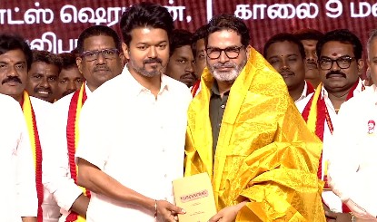 अभिनेता से नेता बने विजय ने बुधवार को अपनी पार्टी तमिलगा वेत्री कझगम (TVK) की पहली वर्षगांठ मनाने के लिए महाबलीपुरम में एक भव्य जनसभा का आयोजन किया। इस बैठक में चुनाव रणनीतिकार प्रशांत किशोर ने विजय के साथ मंच साझा किया। प्रशांत किशोर को चुनावों के लिए विजयी अभियान तैयार करने के लिए जाना जाता है, इसलिए TVK की वर्षगांठ के कार्यक्रम में उनकी उपस्थिति महत्वपूर्ण मानी जा रही है। माना जा रहा है कि वे आगामी तमिलनाडु चुनावों में TVK के लिए रोडमैप तैयार करेंगे।