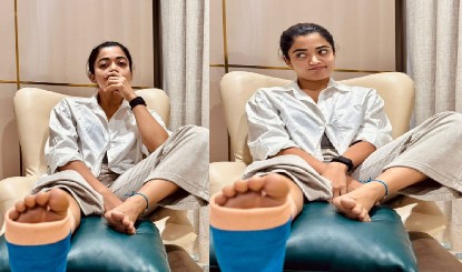 रश्मिका के पैर पर प्लास्टर लगा हुआ है
