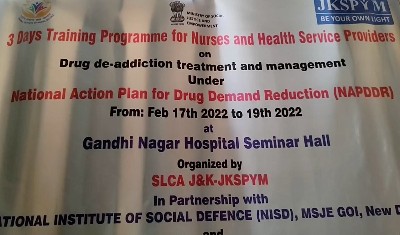नशीली दवाओं की मांग में कमी के लिए राष्ट्रीय कार्य योजना के तहत केंद्रीय सामाजिक न्याय और अधिकारिता मंत्रालय की जम्मू-कश्मीर राज्य स्तरीय समन्वय एजेंसी ने "नशीली दवाओं के उपचार और प्रबंधन" को लेकर तीन दिवसीय प्रशिक्षण कार्यक्रम का आयोजन किया। इस कार्यक्रम में जीएमसी जम्मू के विभिन्न विभागों, नशामुक्ति केंद्रों और नर्सिंग कॉलेजों के लगभग 40 प्रतिभागी शामिल हुए। कार्यक्रम का उद्घाटन जम्मू के मेटरनिटी हॉस्पिटल में गवर्नमेंट मेडिकल कॉलेज के प्रिंसिपल और डीन डॉ मधुसूदन शर्मा ने किया। इस अवसर पर मधुसूदन शर्मा ने कहा कि हमारे समाज से नशीली दवाओं के खतरे को रोकने के लिए इस तरह के कार्यक्रम समय की जरूरत है और इसमे सहयोगात्मक प्रयास किए जाने चाहिए।