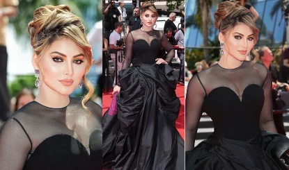 उर्वशी रौतेला ने नाजा सादे कॉउचर द्वारा एक ब्लैक सिल्क तफ़ता गाउन पहना था। लंबी पारदर्शी आस्तीन और एक उच्च नेकलाइन के साथ, सैसी नंबर में ड्रामा और एलिगेंस का एक शानदार मिश्रण था। बोल्ड स्वीटहार्ट नेकलाइन ने आउटफिट को एक आकर्षक मोड़ दिया।