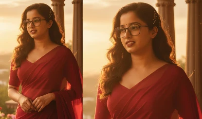 'इस व्यक्ति को 90 के दशक की बॉलीवुड हीरोइन की तरह एक बहती हुई लाल शिफॉन साड़ी में बदलें। उसके बाल नरम लहरों में हों। बैकग्राउंड रोमांटिक और नाटकीय लगे, जिसमें गर्म टोन और सूरज डूबने की सुनहरी रोशनी हो।'