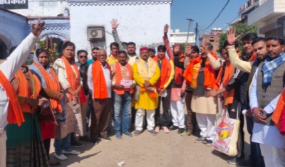 अयोध्या। उत्तर प्रदेश में जहां आज से मतदान की प्रक्रिया प्रारंभ हो गई है। तो वहीं अयोध्या में 27 फरवरी को मतदान होगा इसको लेकर विश्व हिंदू परिषद व संघ मतदाताओं को इस महा उत्सव में भाग लेने के लिए जागरूक कर रहे हैं इसके लिए एक अनोखा तरीका निकाला है दरसल जहां उत्तर प्रदेश में चुनाव की प्रक्रिया चल रही है तो वही अयोध्या में भगवान श्री राम के भव्य मंदिर निर्माण के सपनों को साकार करने वाले सरकार के प्रति जागरूक करने के लिए मतदाताओं को घर भगवान श्री राम के प्रसाद और जन्म भूमि की मिट्टी रज को घर-घर वितरित किया जा रहा है और लोगों से अपील भी रहे है।