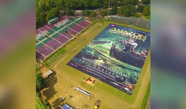कोलकाता। किसी बांग्ला फिल्म का सबसे बड़ा पोस्टर मोहन बागान फुटबॉल मैदान में पेश किया गया। यह 60,800 वर्ग फुट का है। इस मौके पर वहां हजारों लोग पहुंचे थे। यह पोस्टर 320 फुट लंबा और 190 फुट चौड़ा है।