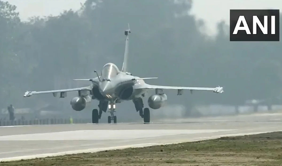 #WATCH | Assam: Indian Air Force's Rafale took off from the Emergency Landing Facility (ELF) on Moran Bypass in Dibrugarh. PM Narendra Modi and others watched the take off.