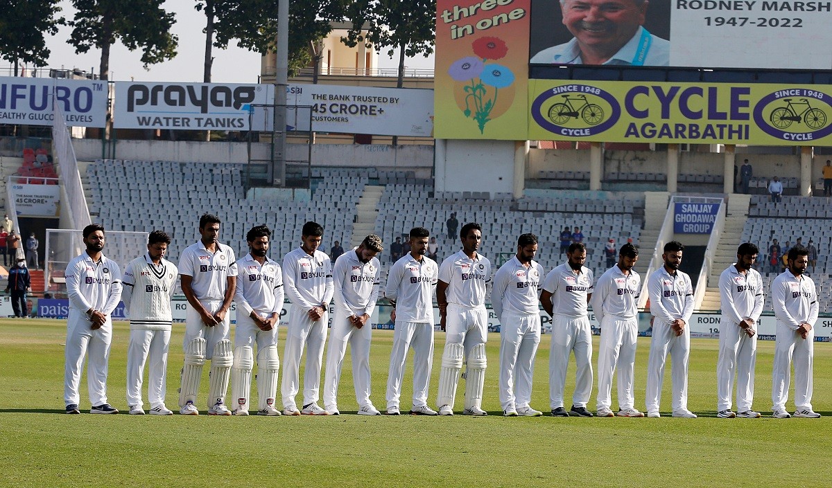 क्रिकेट के महानतम खिलाड़ियों में से एक शेन वार्न का शुक्रवार को निधन हो गया। वह महज 52 साल के थे। शेन वार्न के निधन से पूरा खेल जगत शोक में डूबा हुआ है। इन सबके बीच आज टीम इंडिया ने शेन वार्न को श्रद्धांजलि दी है। भारतीय क्रिकेट टीम इस वक्त श्रीलंका के खिलाफ मोहाली में टेस्ट मैच खेल रही है। दिन का खेल शुरू होने से पहले दोनों ही टीमों के खिलाड़ियों ने शेन वार्न के निधन पर 2 मिनट का मौन रखा। इसके साथ ही बाह पर ब्लैक आर्मबैंड भी पहना। शेन वार्न के साथ-साथ पूर्व ऑस्ट्रेलियाई क्रिकेटर रोड मार्श को भी श्रद्धांजलि दी गई। उनका भी निधन बीते दिन ही हुआ था। भारतीय क्रिकेट बोर्ड (बीसीसीआई) ने बयान में कहा कि रोड मार्श और शेन वार्न के लिये पहले टेस्ट के दूसरे दिन का खेल शुरू होने से पहले एक मिनट का मौन रखा गया। इन दोनों खिलाड़ियों का कल निधन हो गया था। भारतीय टीम ने आज काली पट्टी बांध रखी है।