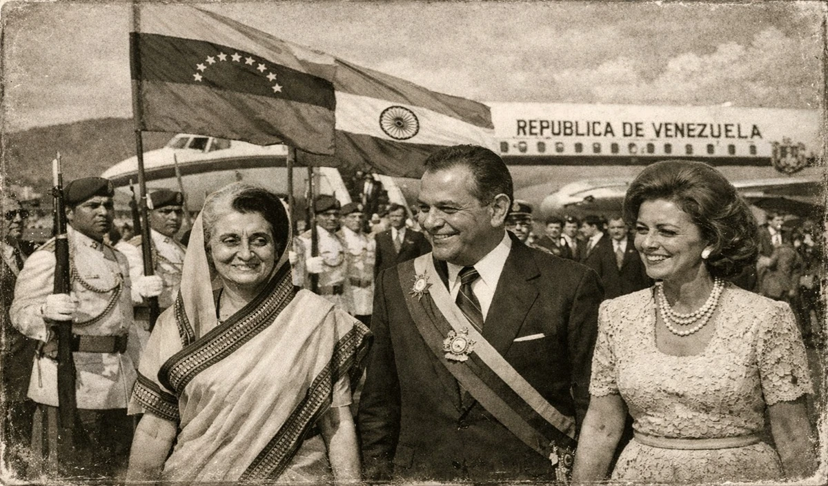 10 अक्टूबर, 1968 को दोपहर के 12:45 बज रहे थे। प्रधानमंत्री इंदिरा गांधी को लेकर एक विशेष विमान विमान वेनेजुएला के साइमन बोलिवर अंतरराष्ट्रीय हवाई अड्डे पर लैंड करता है। वातावरण उत्साह से भरा हुआ था, क्योंकि यह पहली बार था जब कोई भारतीय प्रधानमंत्री इस लैटिन अमेरिकी देश का दौरा कर रही थीं। गांधी का स्वागत वेनेजुएला के राष्ट्रपति राउल लियोनी और उनके मंत्रिमंडल के मंत्रियों ने किया। विमान से उतरते ही, सैन्य बैंड ने पहले भारतीय राष्ट्रगान बजाया, उसके बाद वेनेजुएला का राष्ट्रगान बजाया गया। गांधी जी की वेनेजुएला यात्रा उनके लंबे लैटिन अमेरिकी और कैरेबियन दौरे का हिस्सा थी, जो 23 सितंबर को कोलंबिया से शुरू हुआ था। उनके यात्रा कार्यक्रम में ब्राजील, चिली, उरुग्वे और अर्जेंटीना भी शामिल थे। हालांकि उन्होंने वेनेजुएला में केवल 18 घंटे बिताए, लेकिन यह यात्रा देश के राजनेताओं और नागरिकों के साथ सौहार्दपूर्ण मुलाकातों से भरी रही। भारत लौटने पर गांधी जी ने लोकसभा में कहा कि अपने दौरे के दौरान उन्हें एहसास हुआ कि "हम दक्षिण अमेरिका के बारे में उतना नहीं जानते जितना दक्षिण अमेरिका हमारे बारे में जानता है। उन्होंने कहा कि महात्मा गांधी, रवींद्रनाथ टैगोर और जवाहरलाल नेहरू के नाम उन सभी देशों में व्यापक रूप से जाने जाते हैं और उद्धृत किए जाते हैं, जहां उन्होंने दौरा किया।